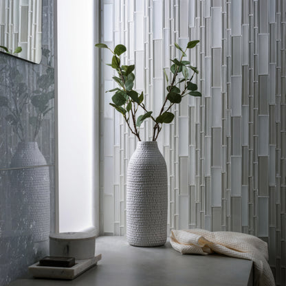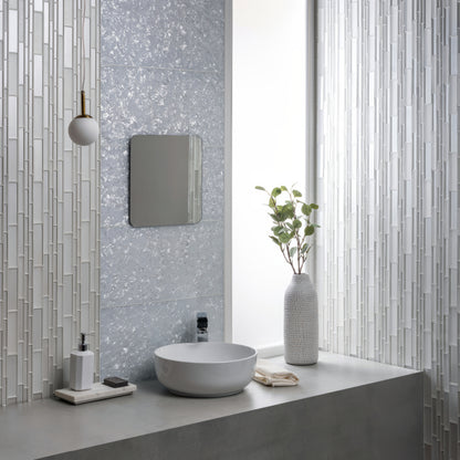 Discover the allure of our ice white crushed pearl effect glass, a sophisticated addition to enhance any interior environment. This large-format piece, part of the esteemed Glassworks range, offers a captivating aesthetic with its lustrous and unique design. Perfect for both dry and wet interior walls, it is crafted with precision, promising to refine your home with a touch of elegance.